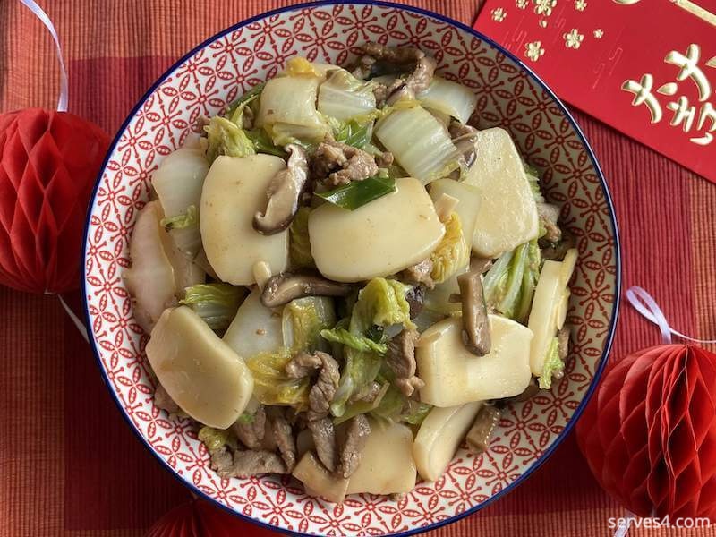 Chinese Rice Cake Stir Fry is one of the traditional lucky foods eaten at Chinese New Year, although it is popular to eat at any time of year.