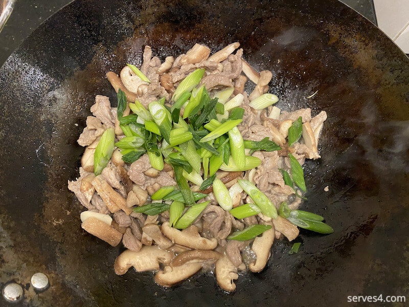 Add the mushrooms and cook until they release some of their moisture, then add the spring onions, and stir fry everything together for a minute or so.