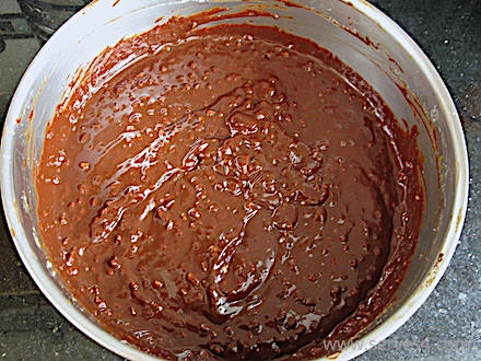 Pour the the chocolate mixture into the cake pan, smooth the top, and bake in the preheated oven for 50-55 minutes.