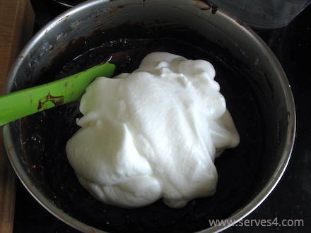 Add another third of the egg white into the chocolate mixture, and gently fold in until incorporated, trying to retain as much air as possible.