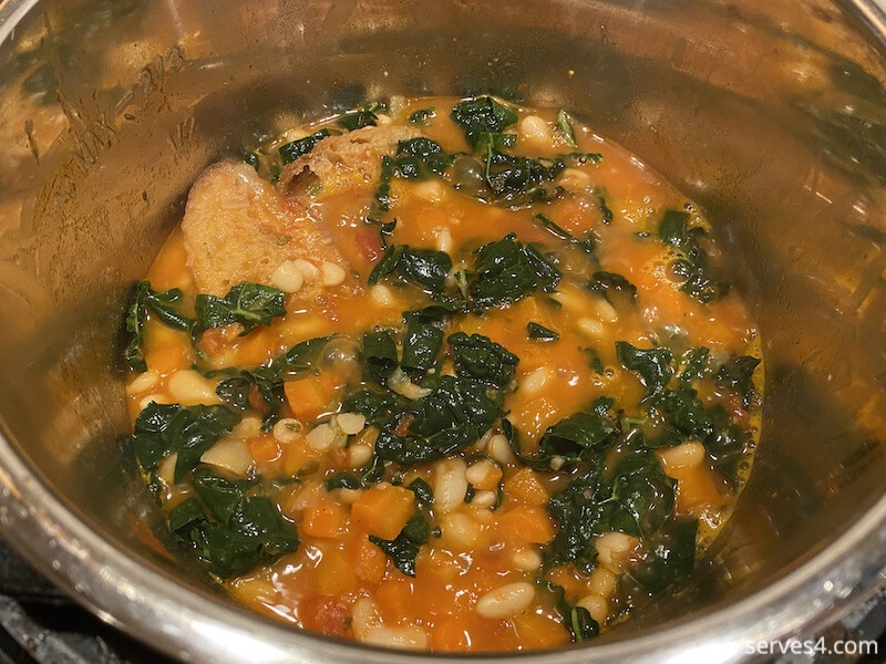 Ribollita means "reboiled", and the soup would traditionally involve "reboiling" leftover vegetable soup and adding chunks of stale bread to fill it out. If you happen to have stale bread ends lying about, this Instant Pot Tuscan Bean Soup really is the perfect recipe for using them up, rather than letting them go to waste. Good quality crusty bread would be ideal, but feel free to use any bread of your choosing.