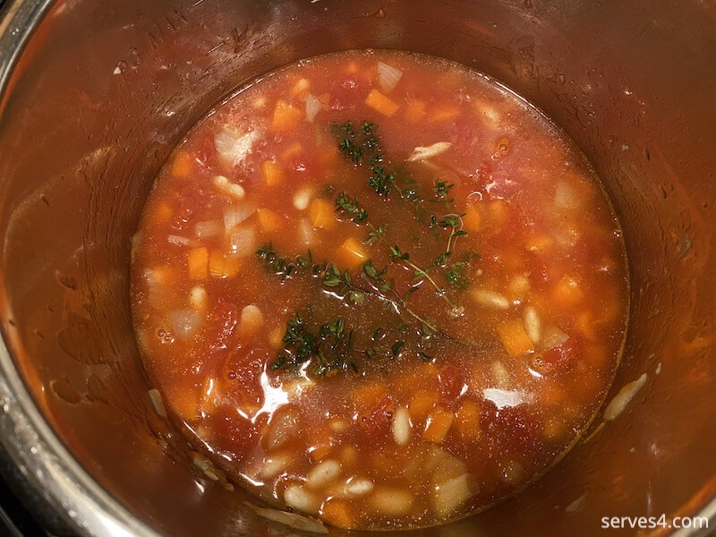 While this Instant Pot Tuscan Bean Soup comes together pretty quickly in the pressure cooker, it does require a bit of advance planning, as the cannellini beans require overnight soaking. If you don't have the luxury of overnight, then soak them first thing in the morning, as they'll require a minimum of eight hours' soaking before cooking. They should swell to about 1.5 time their dried size, and the skins should start coming loose.